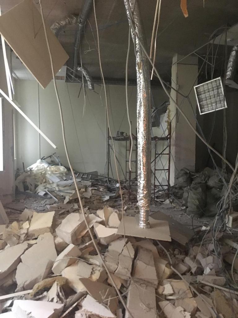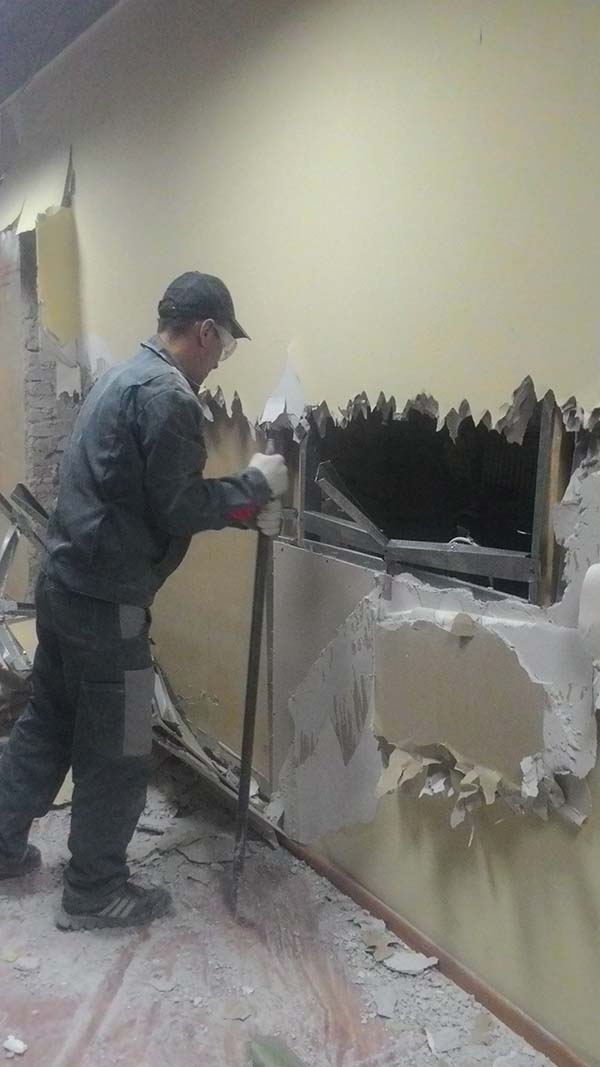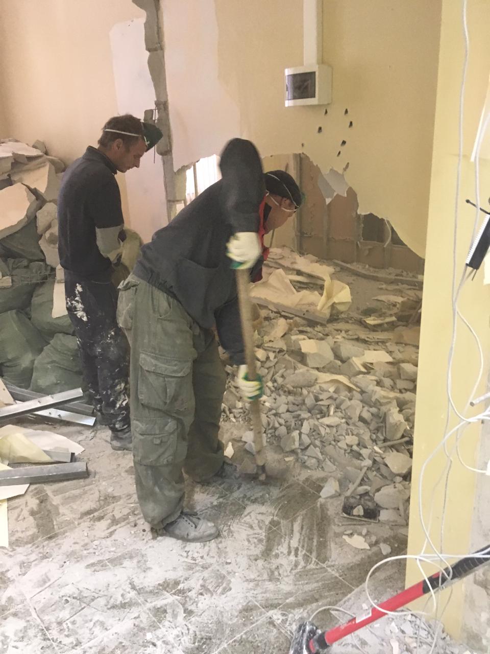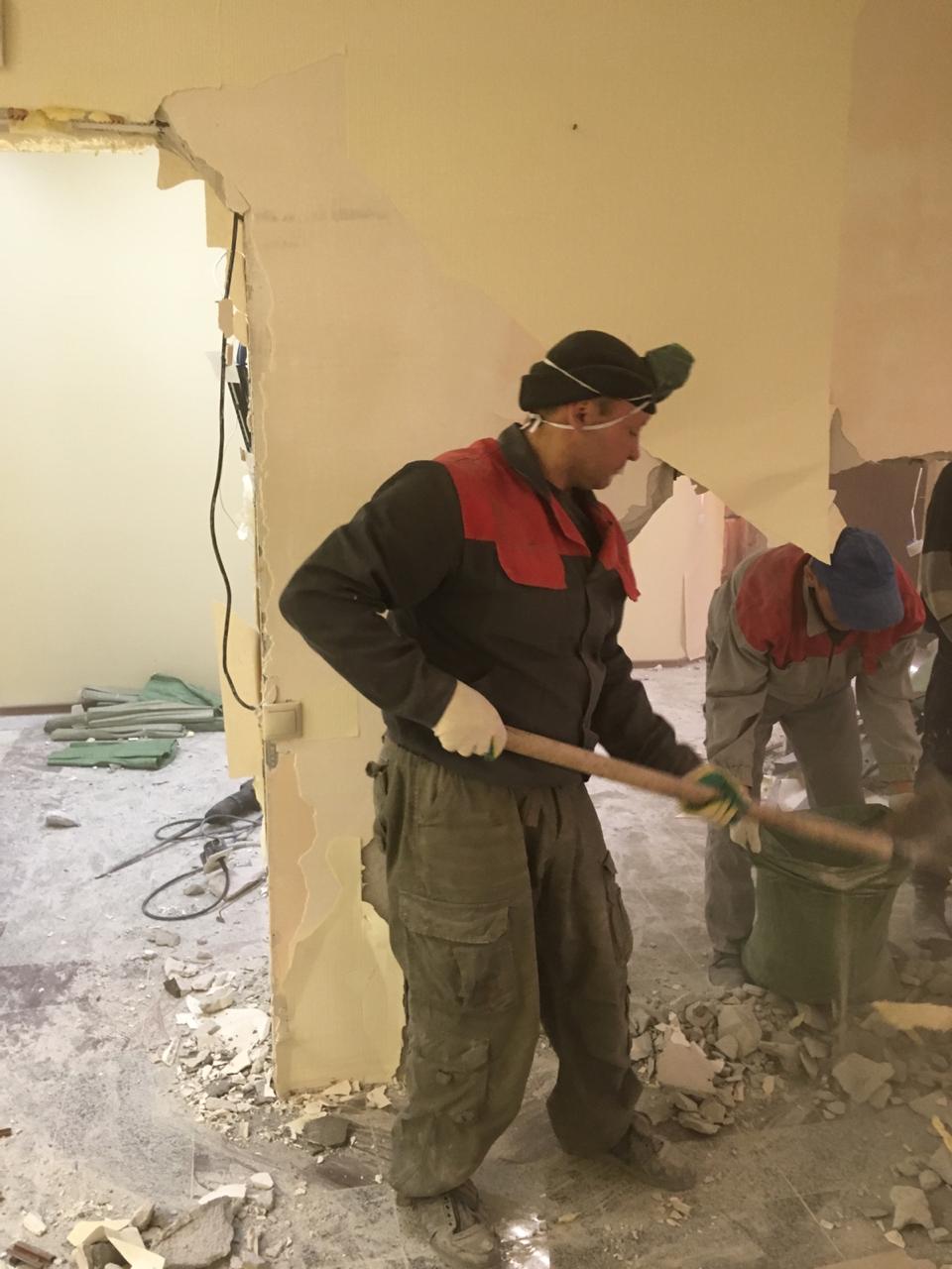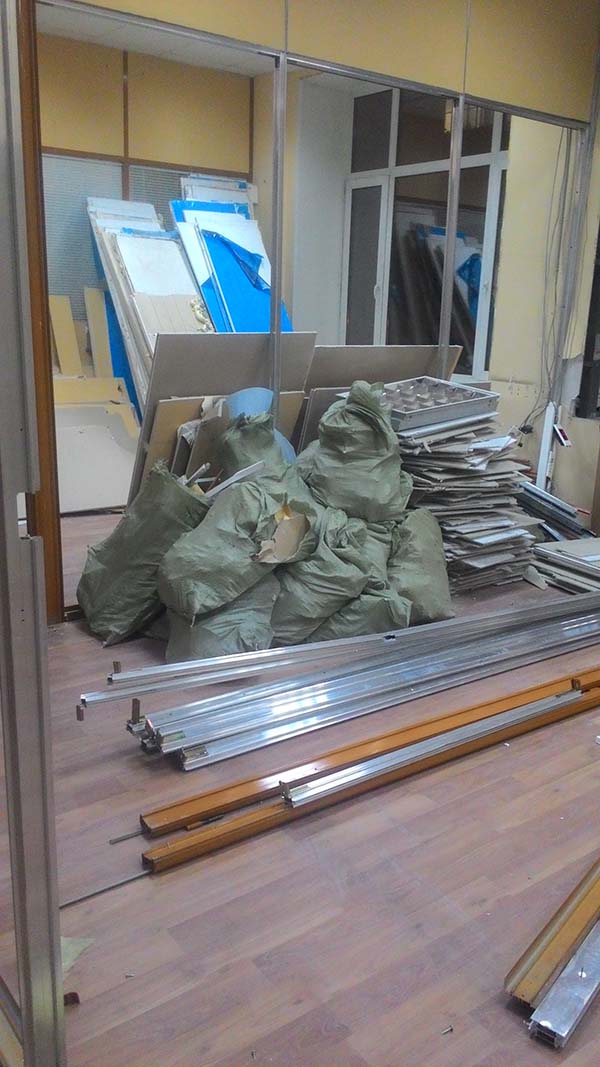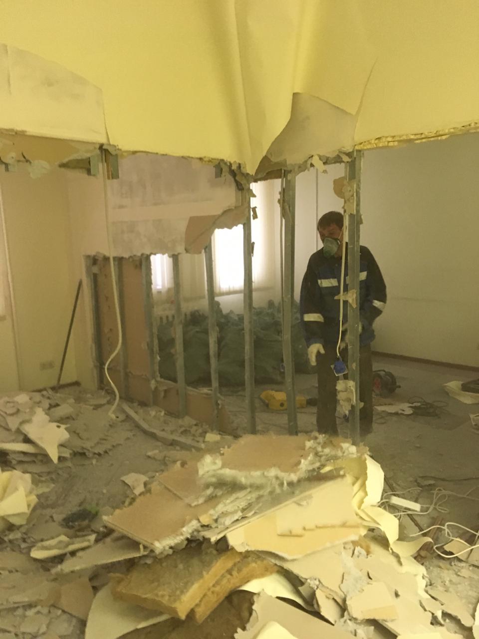 Частичный демонтаж в офисе 95 м² (Щипок). За 4 дня разобрали ГКЛ-перегородки, сняли потолок «Армстронг», очистили стены от штукатурки, демонтировали сантехнику/электрику/сигнализацию. Мусор упаковали, вручную спустили с 4 этажа и вывезли 2 контейнерами по 27 м³.